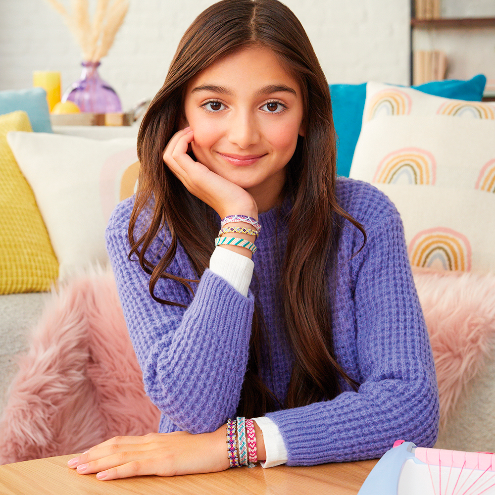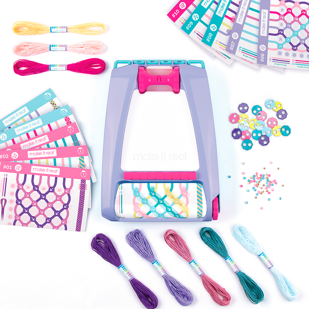 Tous les matériaux et gabarits de bracelet se rangent soigneusement à l'intérieur de la fabrique. Vous pouvez utiliser les 10 modèles de bracelet d'amitié inclus ou visiter makeitrealplay.com pour accéder à des modèles de bracelet supplémentaires à imprimer et à des tutoriels vidéo pour encore plus de plaisir.