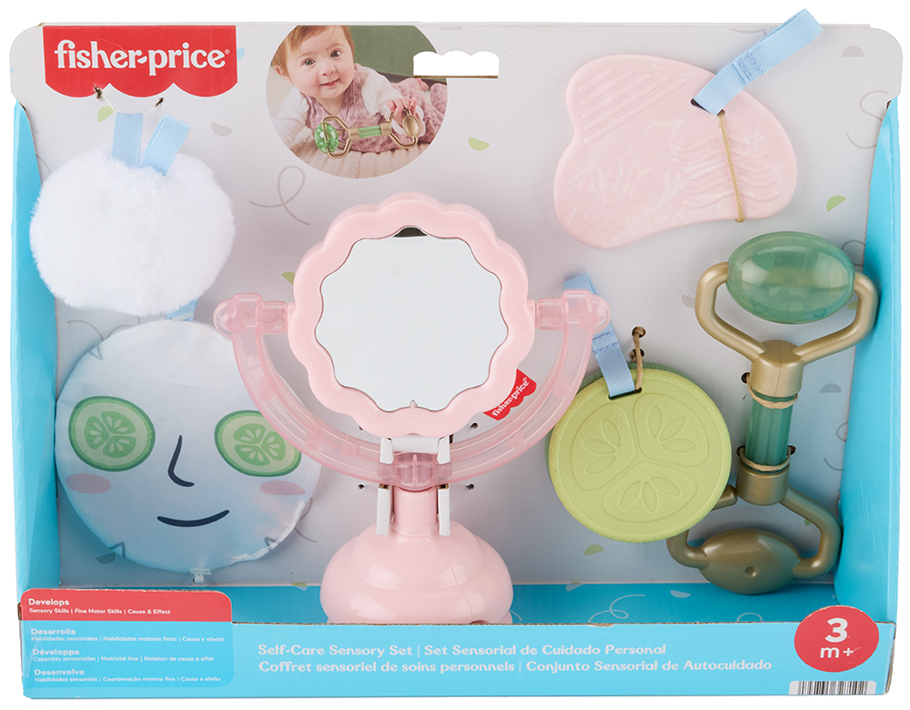 Bébé peut suivre la tendance Prépare-toi avec moi avec ce coffret sensoriels de soins personnels Moments Mini-Moi de Fisher-Price. Comportant des jouets d’éveil classiques pour nouveau-nés inspirés d’articles de soins personnels pour adultes, ce coffret-cadeau de 6 éléments comprend 1 rouleau pour le visage hochet, 1 applicateur couineur, des tranches de concombre cliquetis, 1 gua sha de dentition, 1 masque pour le visage à deux faces qui bruisse et 1 miroir rotatif. Les tout-petits peuvent se gâter avec un jeu sensoriel captivant qui favorise également la prise en main, la curiosité et la compréhension de la relation de cause à effet. Les couleurs et les motifs peuvent varier.