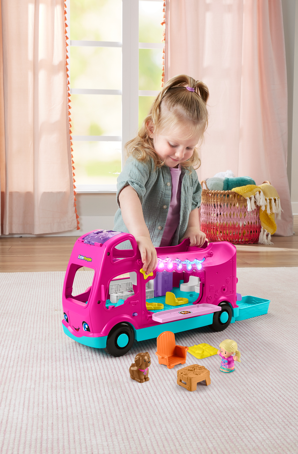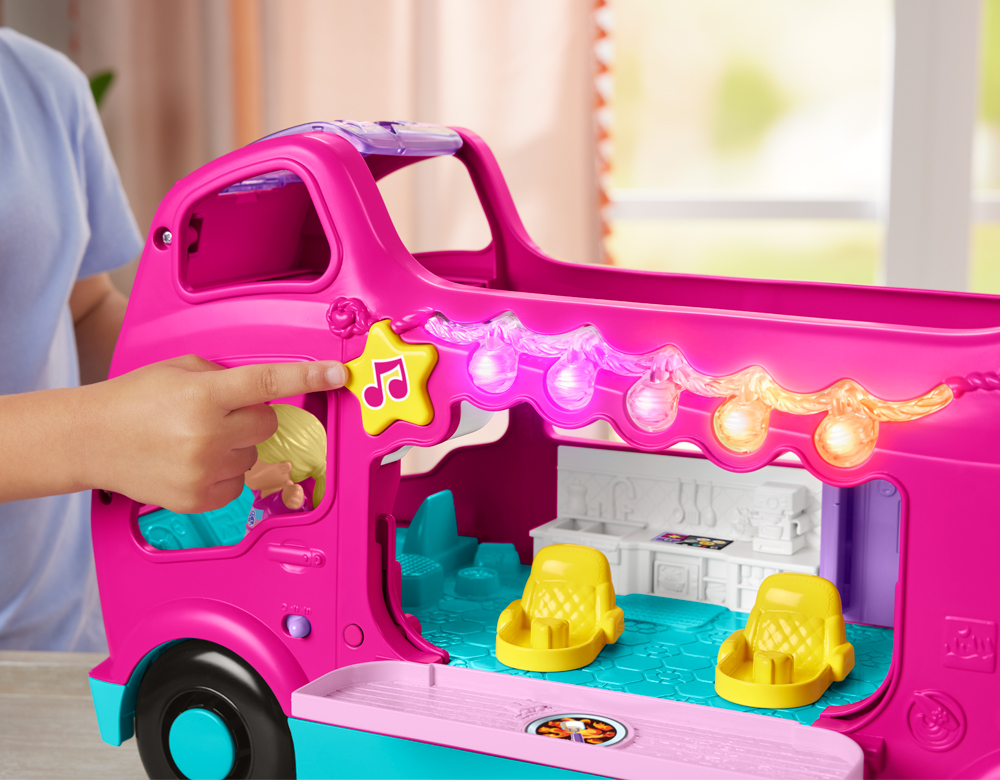 Embark on an adventure with Barbie's Dream Camper! This fully equipped vehicle is ready for outdoor escapades, complete with a pool so Barbie, Little People, and her dog can cool off and have fun. Additionally, this interactive toy is available in two languages! Place the figure on the driver's seat to hear fun sounds, or on the star to enjoy upbeat music, funny noises, and exciting phrases. Ready for adventure?