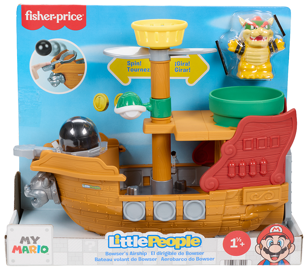 Toddlers can dive into the exciting world of Super Mario with this Little People My Mario Bowser’s Airship playset from Fisher-Price! Inspired by the iconic game, this push-along toy boat is packed with fun activities designed just right for preschoolers including a cannonball launcher, bat-at spinners, and a trapdoor pipe for drop-through play. As kids roll the vehicle along, Bowser’s Airship bobs up and down in a cool wave-like motion!