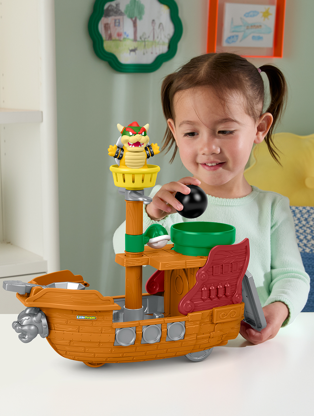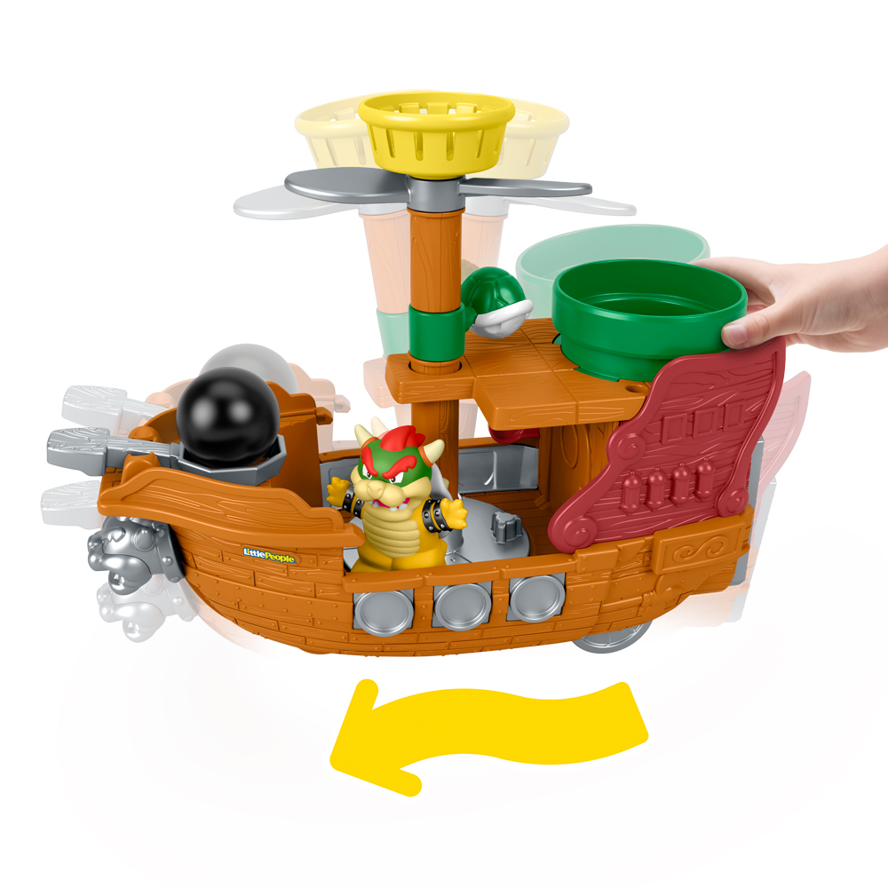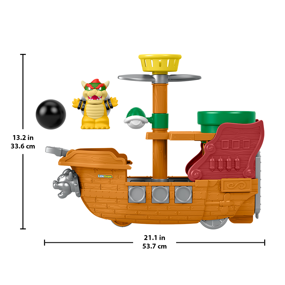 Les tout-petits peuvent plonger dans l’univers palpitant de Super Mario avec ce coffret La Forteresse Volante de Bowser Little People de Fisher-Price! Inspiré du célèbre jeu vidéo, ce bateau à pousser regorge d’activités amusantes conçues spécialement pour les jeunes enfants, notamment un lanceur pour boulet de canon, des éléments rotatifs à tapoter et un tuyau doté d’une trappe dans lequel glisser des objets. Lorsque les enfants font rouler La Forteresse Volante de Bowser, celle-ci se déplace de haut en bas, comme si elle voguait sur les flots!