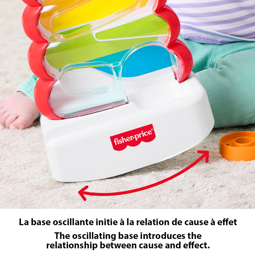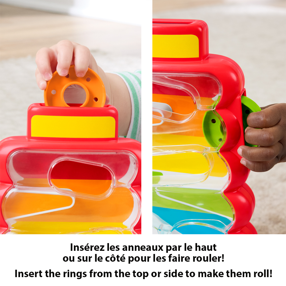 Inspired by the classic Fisher-Price Rock-a-Stack ring stacking toy, this wobbly drop-through activity toy introduces your baby to the fun of cause and effect! The Drop Through Rock-A-Stack comes with 5 colorful rings for little ones to slot through the top or side of the maze and watch as they roll down, around, and out the bottom. For added cause & effect fun, the maze features a wibbly-wobbly base, just like the original Rock-a-Stack toy!
