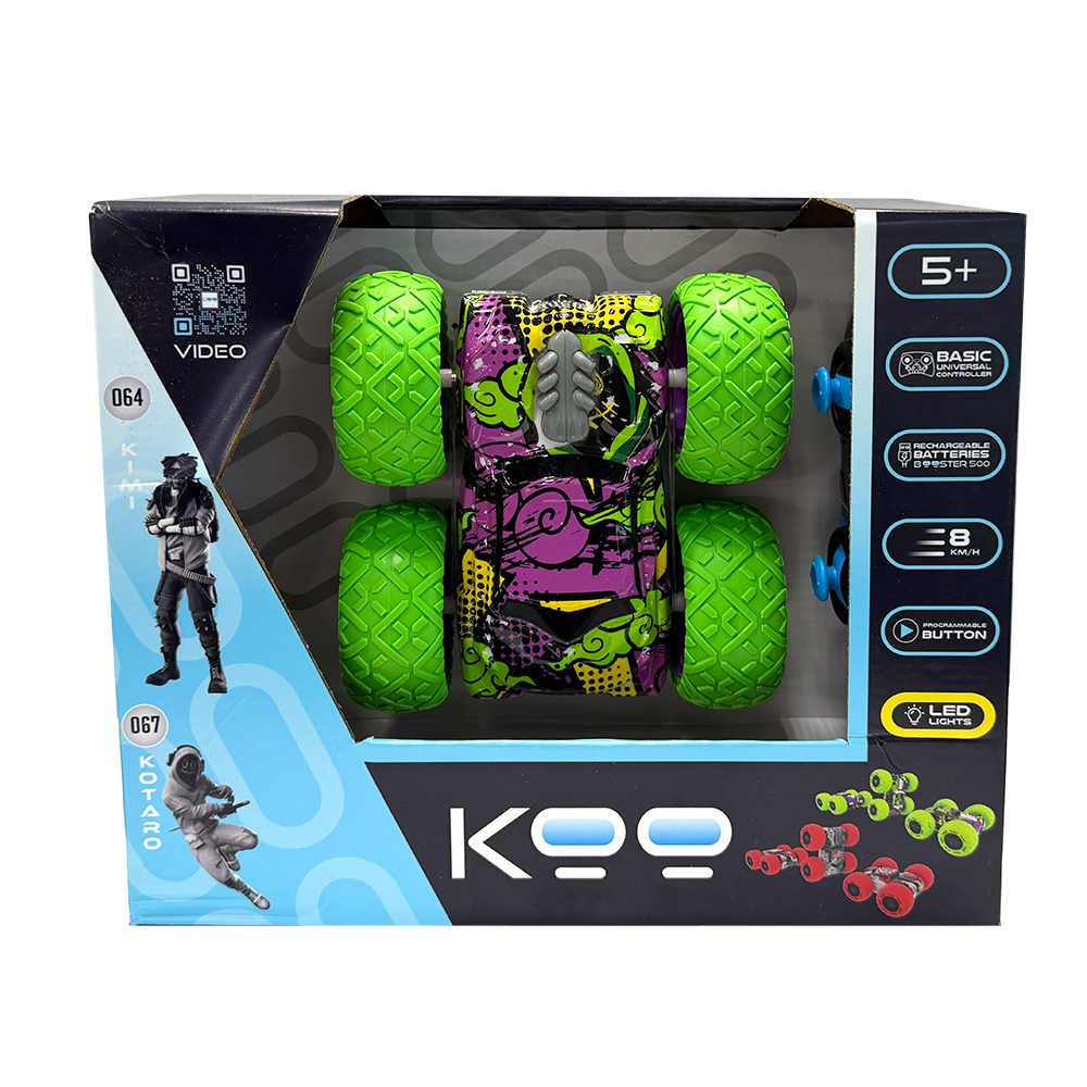 À la vue d'un mur ou d'un escalier, il ne s'arrête jamais. Il les affronte de front et revient toujours en position de conduite. Cette voiture peut se retourner et continuer à rouler des deux côtés grâce à son capteur spécifique. Elle ne craint aucun mur et se retourne simplement de l'autre côté pour poursuivre sa route. Avec ses pneus souples et sa forme spécifique, cette voiture peut franchir tous les obstacles et rouler sur tous les terrains. Cette voiture est équipée de lumières LED qui lui donnent un look incroyable et lui permettent de rouler même dans les endroits les plus sombres. La manette KOO est universelle et vous permet de conduire toutes les voitures KOO. Vous pouvez enregistrer des séquences de la voiture et les rejouer à la demande à l'aide de votre télécommande. Toutes les voitures KOO sont équipées de batteries rechargeables « E-KOO FRIENDLY », car il est temps de changer les choses.