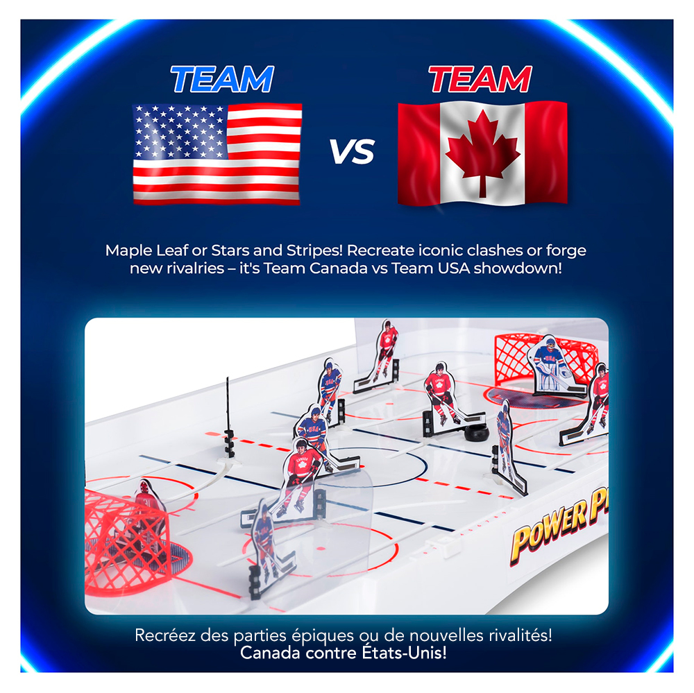 Power Play 2 est un jeu de table classique de hockey sur tige qui simule une véritable action de hockey sur glace. Ce jeu est composé d'une base en plastique durable et est ''FABRIQUÉ AU CANADA'' par Irwin Toy depuis plus de 30 ans. C'est un grand jeu familial pour 2 à 4 joueurs avec une surface de jeu de 71,4 x 43 cm (36 x 17 pouces) et offre aux enfants la même excitation que leurs parents quand ils y jouaient dans leur jeunesse. Le jeu offre également des joueurs réalistes avec un jeu derrière le filet et un système de récupération facile de la rondelle. Des écrans transparents sont également fournis avec le jeu pour garder les rebonds sur la surface de jeu.