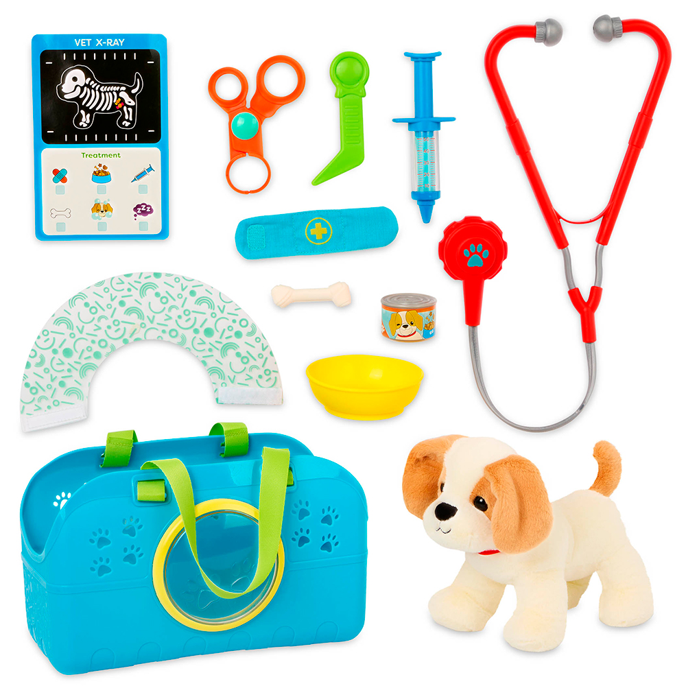 Transformez-vous en vétérinaire avec l'ensemble Happy Puppy Vet de Battat ! Ce kit vétérinaire de 11 pièces encourage les jeux éducatifs grâce à son adorable chiot en peluche et à ses accessoires médicaux. Le chiot a-t-il un rhume ? Utilise le stéthoscope pour écouter les battements du cœur du chiot ! Un bobo ? Appliquez le bandage souple. Sont également inclus un cône pour animaux, des pinces, une pince à épiler, une seringue jouet et une liste de contrôle pour plus d'occasions de jouer au le vétérinaire. Il se sent mieux ? Nourrissez-le avec la boîte de nourriture et offrez-lui un os. Ensuite, mettez votre animal en peluche dans sa cage de transport pour partir à l'aventure ! Jouer avec des animaux en peluche et des jouets médicaux stimule l'imagination et encourage l'empathie.