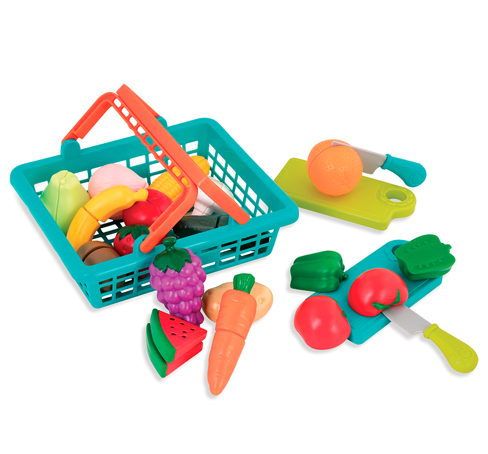 Alors que papa et maman préparent le dîner, les cuisiniers en herbe pourront créer d’étonnants plats de légumes ou d’originales salades de fruits! Munis de leur couteau, ils découpent sur la planche les fruits et légumes qui se détachent par moitié grâce à un petit velcro. Et pour recommencer, il suffit de les recoller!