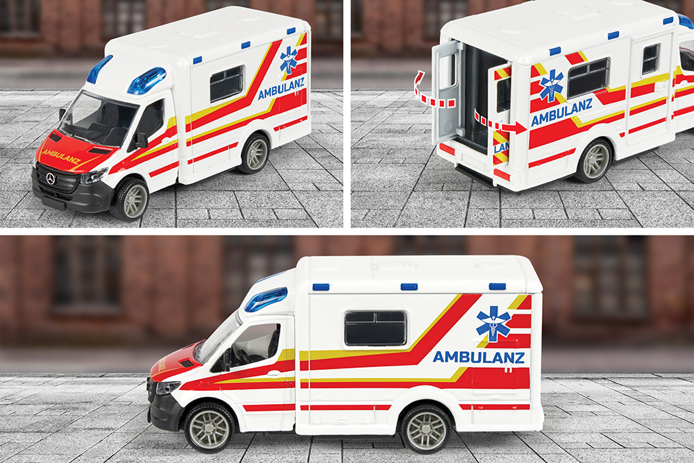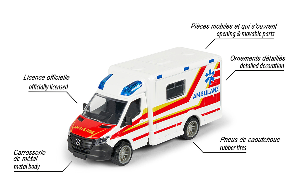 Intervenez dans toutes les urgences avec l’ambulance Mercedes-Benz Sprinter! Ce modèle réaliste à roues libres comprend une cabine et une carrosserie en métal moulé, une porte arrière ouvrante et des accessoires pour enrichir le jeu. Avec ses pneus souples en caoutchouc et son format 15 cm à l’échelle 1:43, il séduira autant les jeunes secouristes que les collectionneurs.