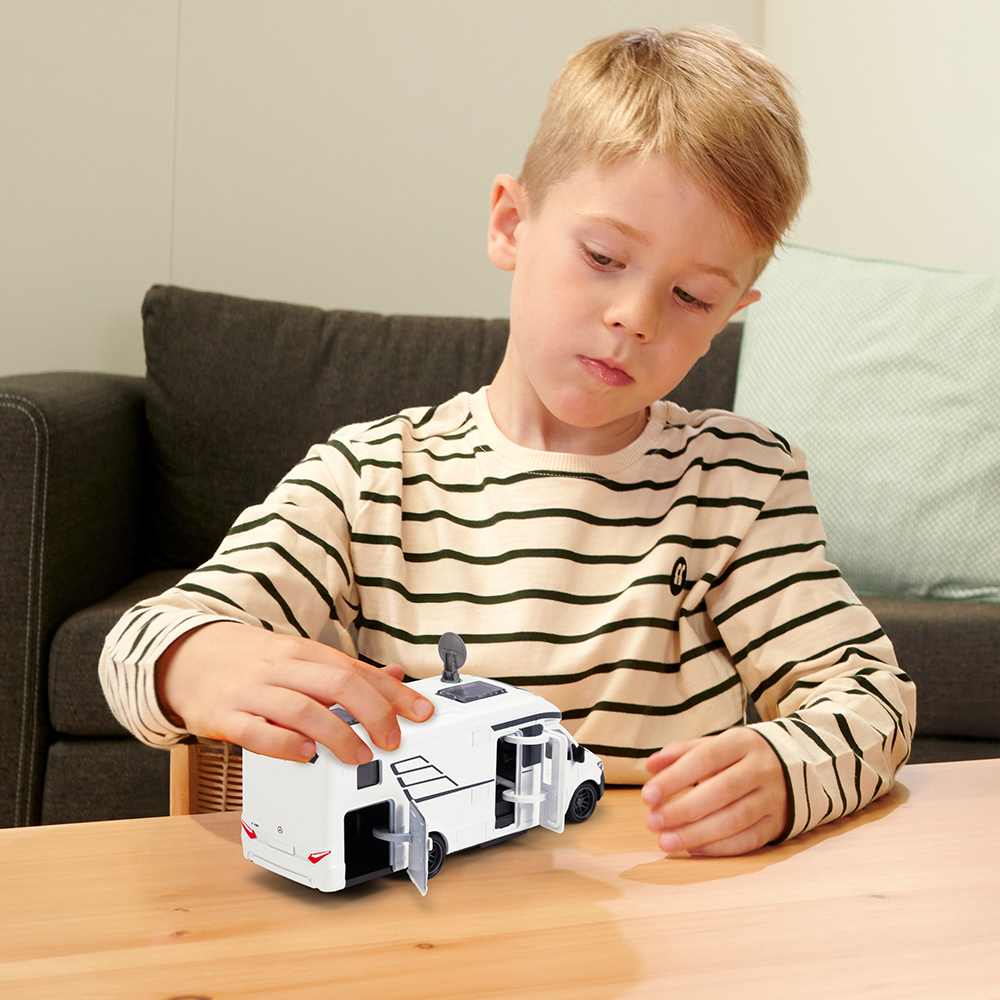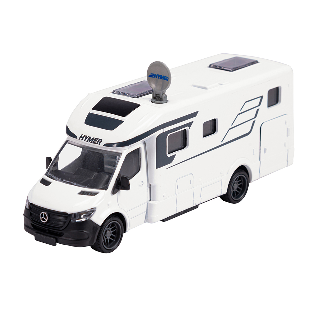 Aimeriez-vous être dans la nature et complètement flexible? Alors le camping-car de Hymer est le cadeau parfait pour les petits et grands fans de voitures. Il existe de nombreuses fonctions pratiques et réalistes. Pour la touche finale, le modèle possède des pneus en caoutchouc souple, des fenêtres transparentes et une antenne satellite rotative qui peut être pliée de haut en bas à volonté et très facilement.