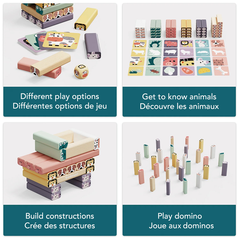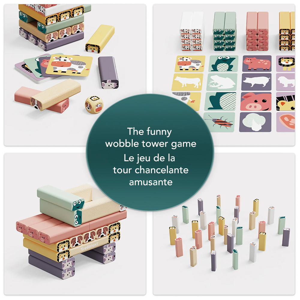 Whether as a classic wobbly tower game, fun dominoes, or creative building and construction - the skill game offers endless fun. Together with friends and family, children build a tall tower. To do this, they place the colorful wooden blocks with cute animal prints on top of each other. And then the fun begins! They take turns rolling the dice or draw a card one after the other. ''Which animal do you see? - A dog!'' Then they carefully pull the matching wooden block with the indicated animal out of the tower and place it on top. But be careful! If the tower collapses, the game is over and it starts all over again. Children let their imagination run wild when building creative constructions with the colorful wooden blocks. The wooden blocks also encourage children to create new patterns again and again when playing dominoes. The fun educational toy playfully promotes the development of young children and stimulates their creativity. At the same time, children train their patience, dexterity, and hand-eye coordination.