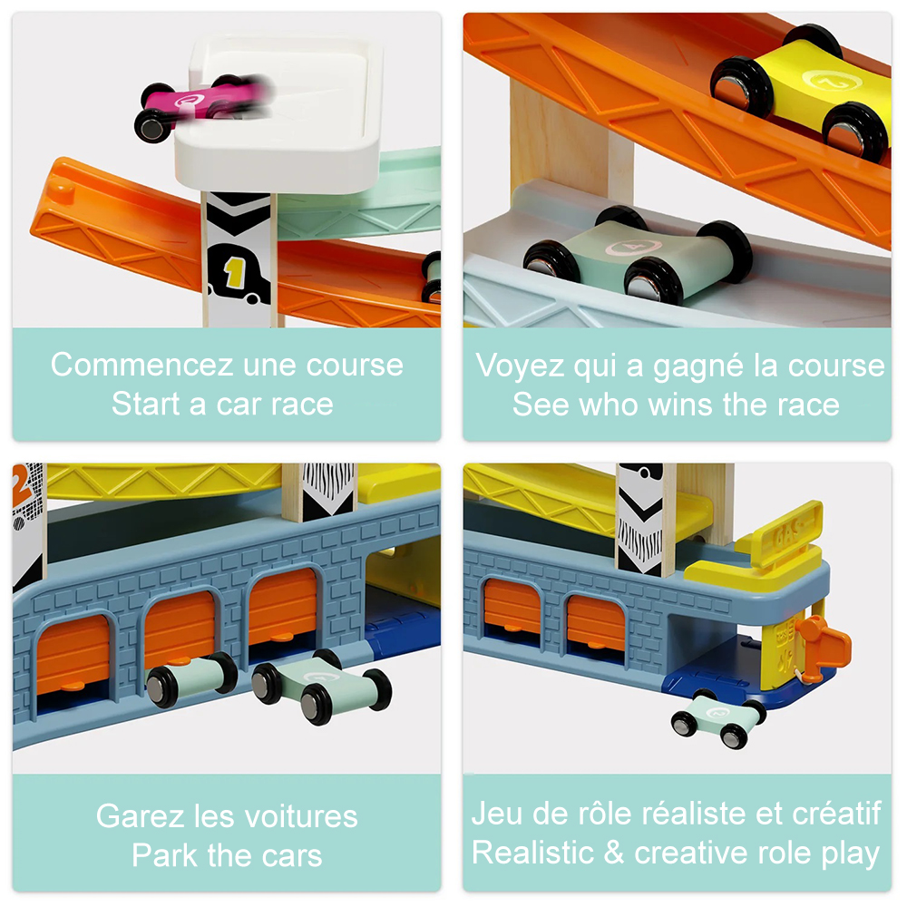 Plunge into the exciting world of car racing with this incredible race track. Children can experience a simulation of car racing with four ultra-fast race cars, four cool ramps, three garages, two parking lots, and a gas station. Who will be the fastest? Kids will love, discovering which car will win the race and thus develop their fine motor skills. With a realistic design and practical accessories, this car racing track is the perfect choice for children who are passionate about car racing and speed. Children can spend hours having fun with this track and experiencing exciting car adventures.