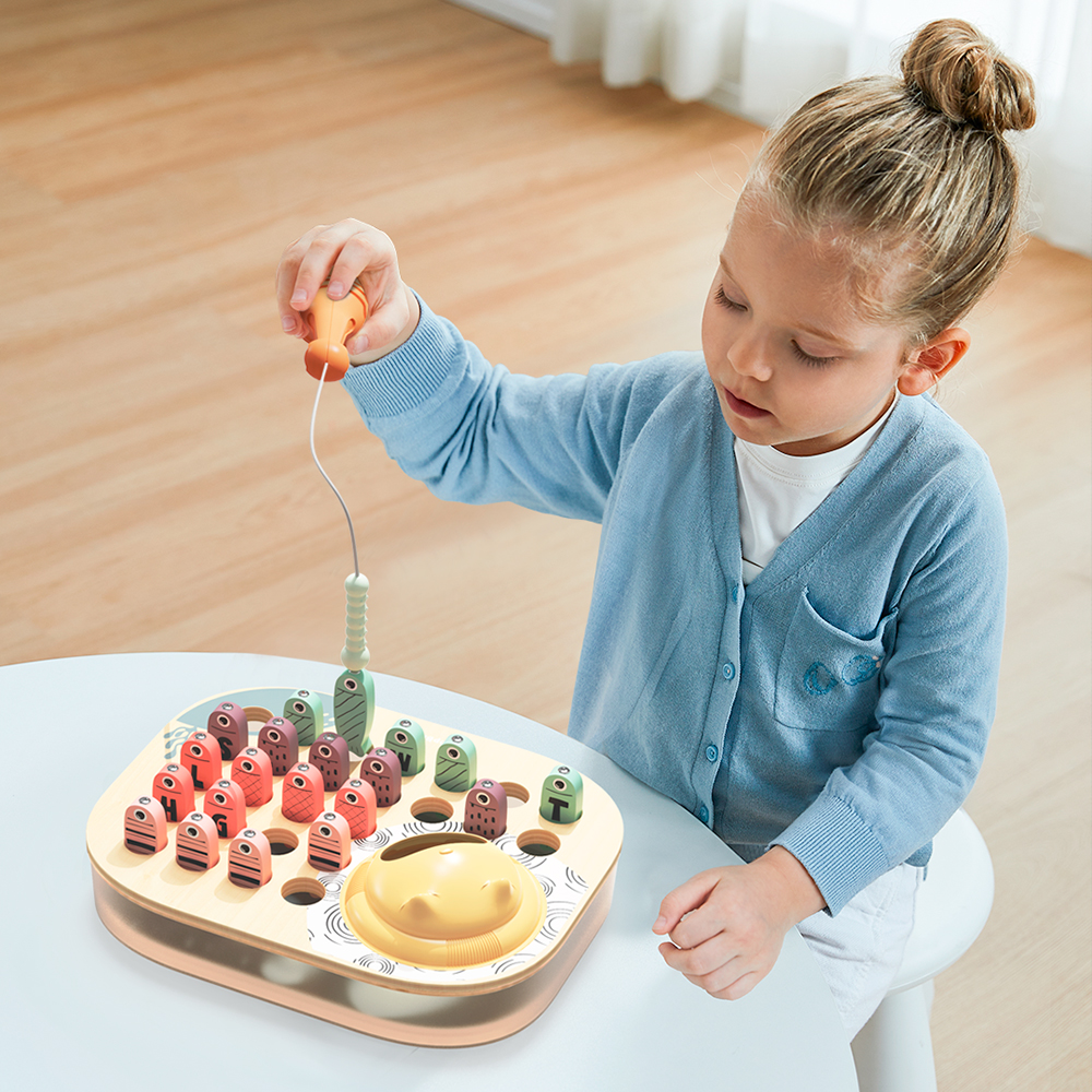 Les enfants de 2 ans et plus développent leur motricité fine et apprennent l'alphabet avec le jeu de poisson ABC. Sur chaque poisson se trouve une lettre que les enfants doivent associer correctement sur le plateau de jeu. Les enfants pêchent les poissons colorés à l'aide d'une canne à pêche ou d'une pince et nourrissent le chat affamé. Seul ou à deux, en pêchant, les enfants exercent leur dextérité et leur coordination œil-main d'une manière très ludique.