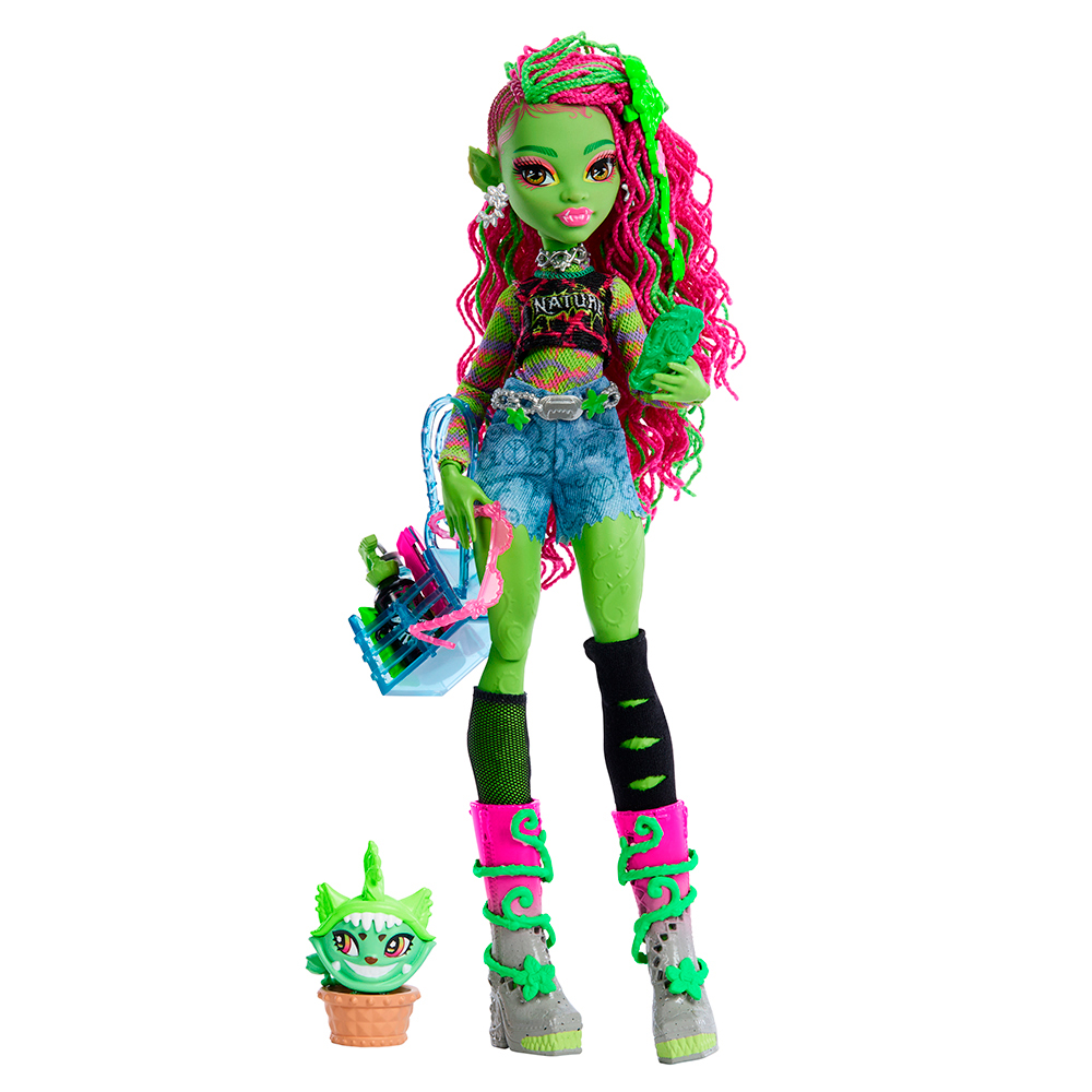 She comes with tons of storytelling pieces for frightful fun. This plant monster has gore-geous naturally textured hair and wears a layered 'Nature' tee with printed shorts, mismatched stockings, and vine-wrapped platform boots. She comes with lots of scare-cessories to make imaginations bloom: a backpack, sunglasses, bootany notebook, hair hydrator, iCoffin, water bottle, and bite bar snack! With her creepy-cute plant-cat Chewlian at her side, Venus McFlytrap is ready for countless creeperific adventures! Check out the whole Monster High collection of dolls and playsets to inspire more fashion fun and fearsome adventures! Each sold separately, subject to availability. Fully articulated. Doll cannot stand alone. Colors and decorations may vary.