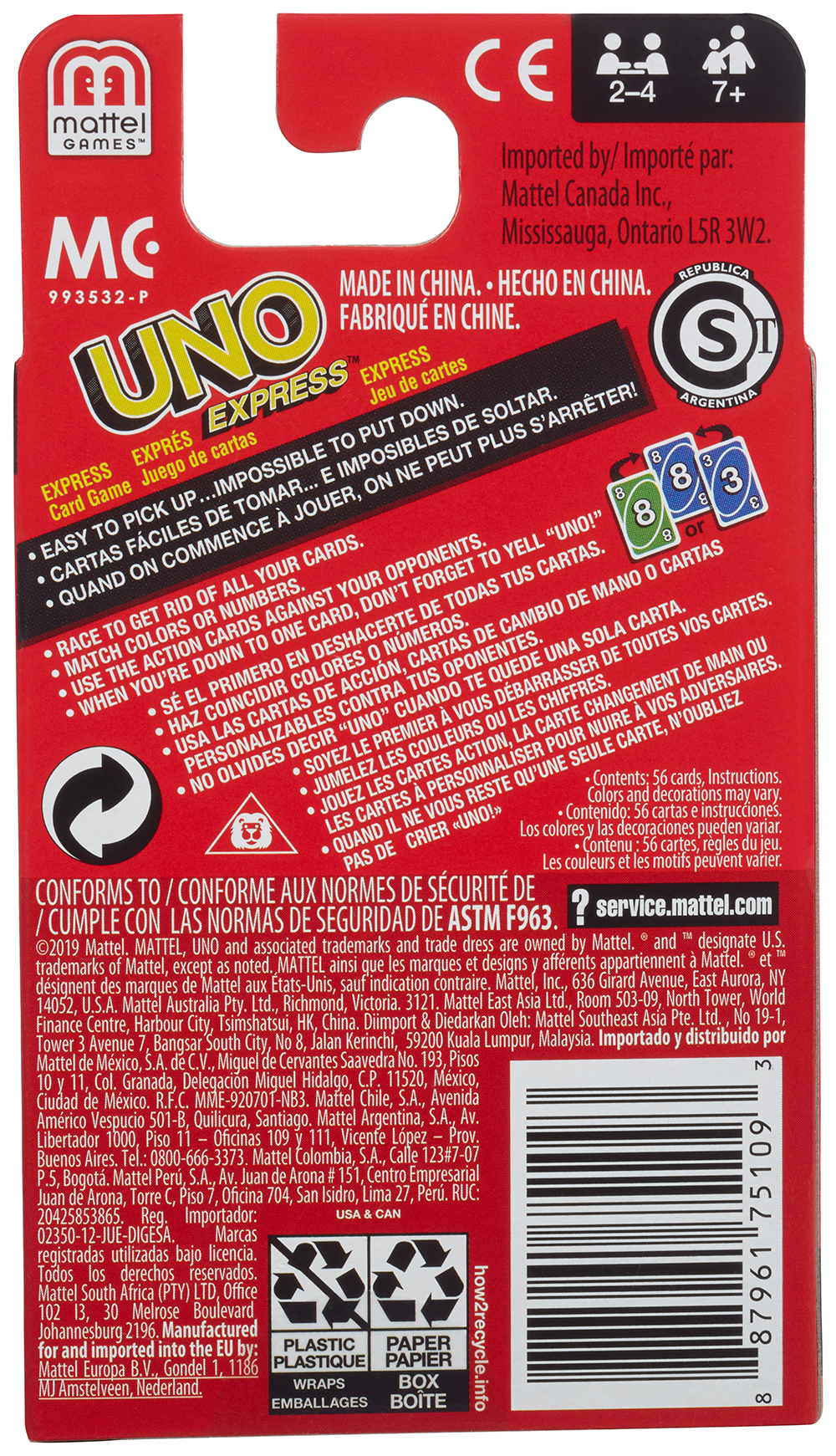 UNO Express™ offre tout le plaisir de UNO™, mais avec une cadence de jeu plus rapide, permettant aux joueurs de terminer les tours plus rapidement! Le format plus petit rend de cette version de UNO™ facile à apporter lors de vos déplacements. Les joueurs jouent, chacun leur tour, pour tenter de faire correspondre une carte dans leur main avec la carte de couleur ou de chiffre sur le dessus de la pile. Les cartes d’action spéciales offrent des moments changeant la donne, car elles remplissent chacune une fonction pour vous aider à vaincre vos adversaires. Quand il ne vous reste plus qu’une seule carte, n’oubliez pas de crier «UNO»! Le premier joueur qui réussit à se débarrasser de toutes ses cartes avant ses adversaires gagne la partie. Excellente compétition de soirée de jeux pour 2 à 4 joueurs.