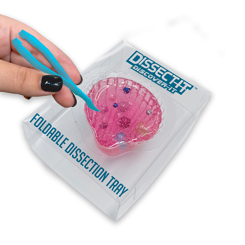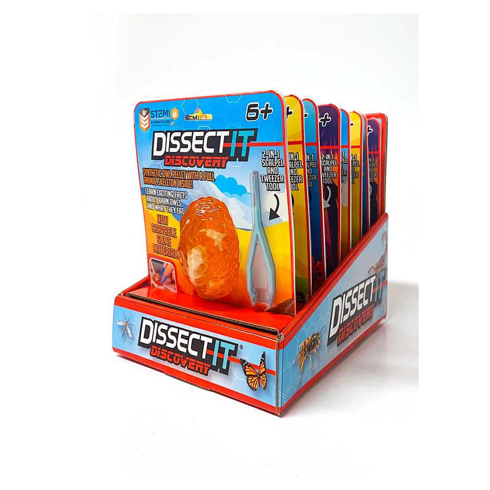 Dissect-It Discover-It is the newest extension to the Dissect-It brand of synthetic STEM dissection kits. Each kit encourages users to explore different parts of nature by dissecting synthetic versions of things such as butterfly cocoon, an owl pellet, an oyster, a piece of amber that are made from a proprietary, carvable, eco-friendly, gelatinlike material.