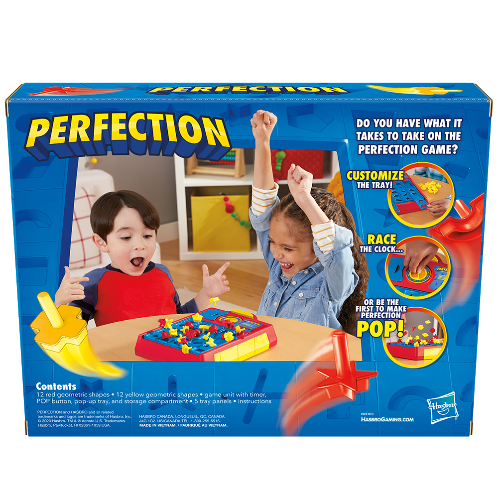 The Perfection game has players on the edge of their seats as they try to beat the clock before the pieces pop! Be the quickest to fit the shapes into their matching holes in the tray. But watch the timer! If it runs out … pop goes the Perfection game! This edition of this fun kids' game of memory lets players customize the trays: rotate them, flip 'em over, and swap them around … there are over 250 different combinations! Players race against the clock before the pieces pop in Single-Player Mode, or play against friends in Multi-Player Mode and be the first to finish and press the pop button themselves. For younger players, play without the timer until they're ready to amp up the action. And, when they're done playing, easily store the pieces inside the game unit.
