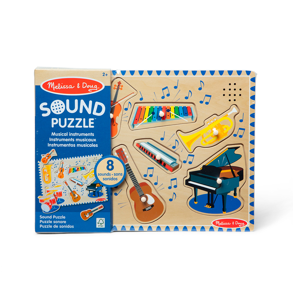 Ce casse-tête sonore motivera l'enfant à insérer les morceaux au bon endroit car il pourra entendre de véritables sons d'instruments de musique! Le puzzle contient 8 morceaux sur la thématique des instruments de musique; l'enfant pourra entendre le piano, la trompette, la batterie, l'harmonica, le tuba, la guitare, le violon et le xylophone! L'image de l'instrument de musique est sous la pièce et le casse-tête est en bois.
