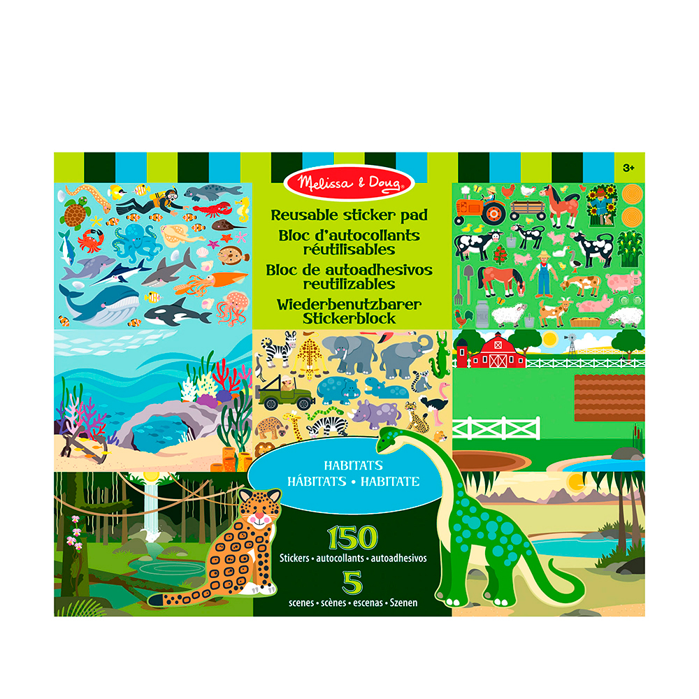Visit a farm, a prehistoric landscape, a desert oasis, a jungle, or the deep blue sea, all in this interactive sticker book!