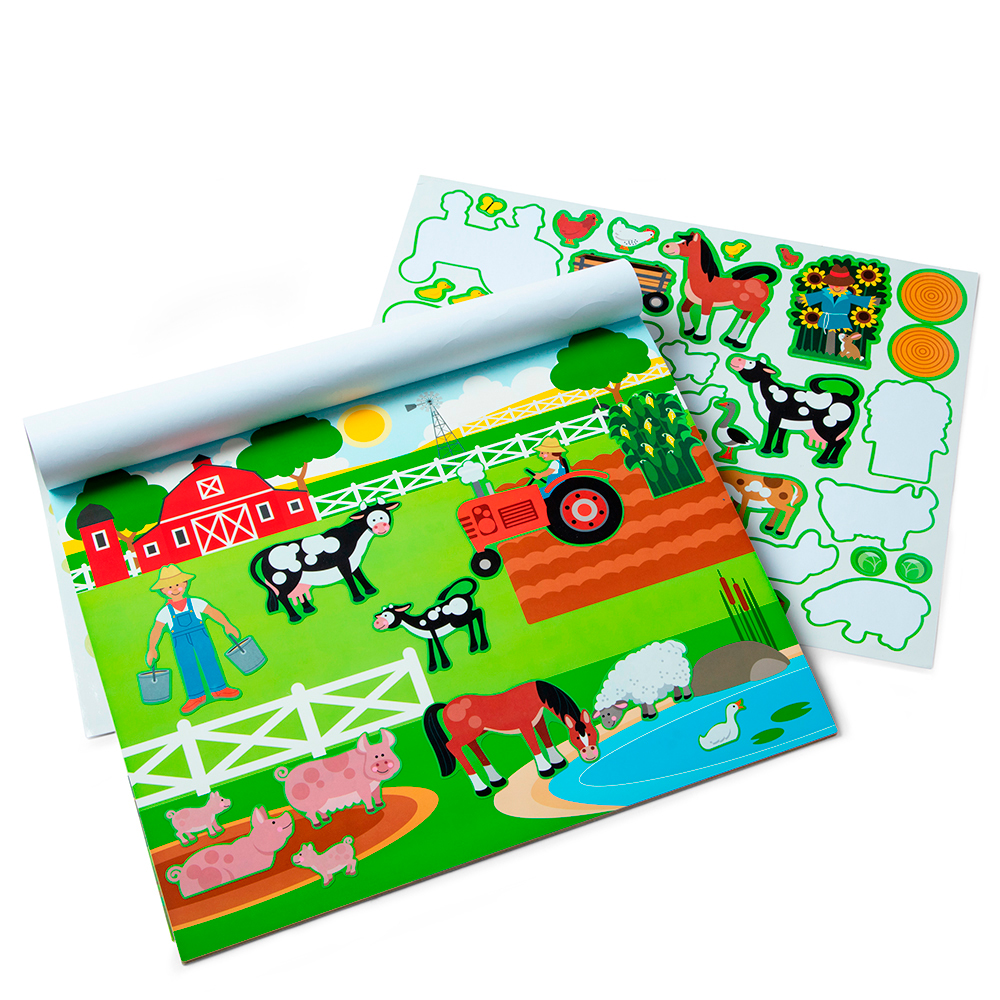 Visitez une ferme, un paysage préhistorique, une oasis dans le désert, une jungle ou la grande bleue dans ce livre d'autocollants interactif!