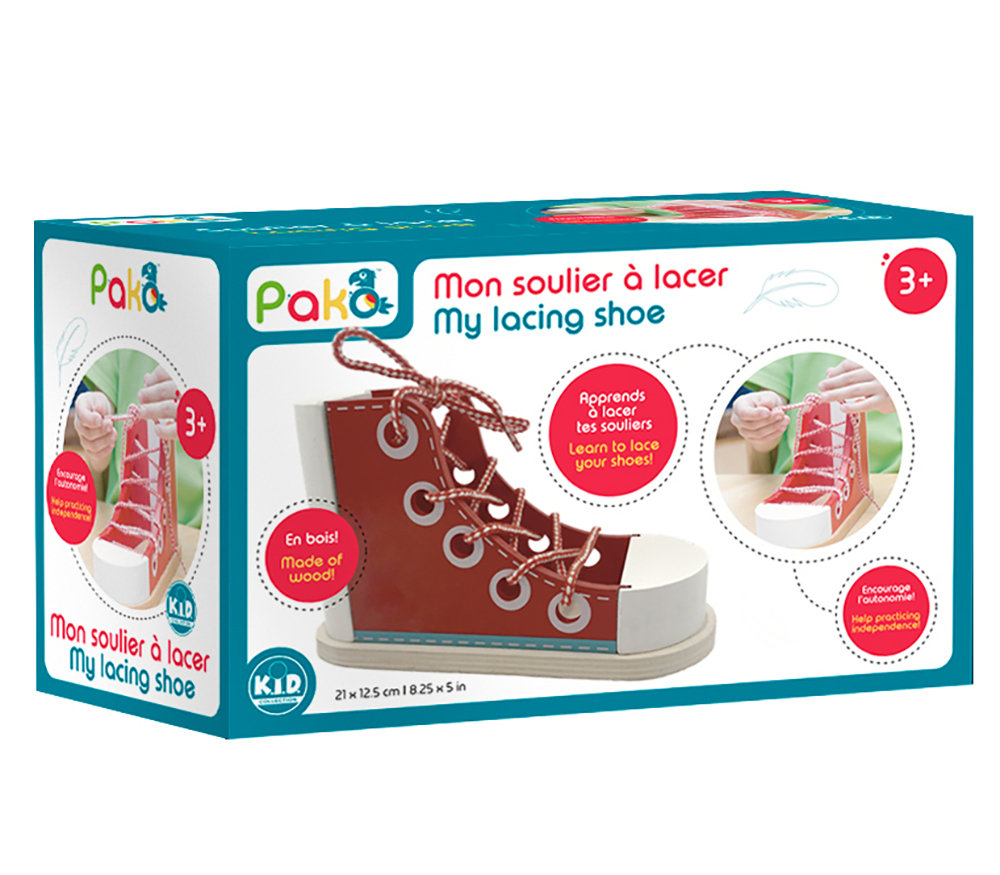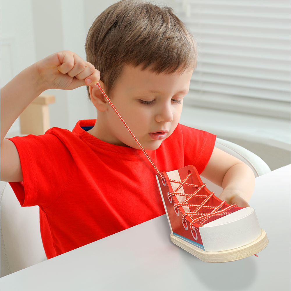 What a great idea to practice shoe-lacing skills! Wooden made, it's perfect to help practicing independence and fine motor skills.