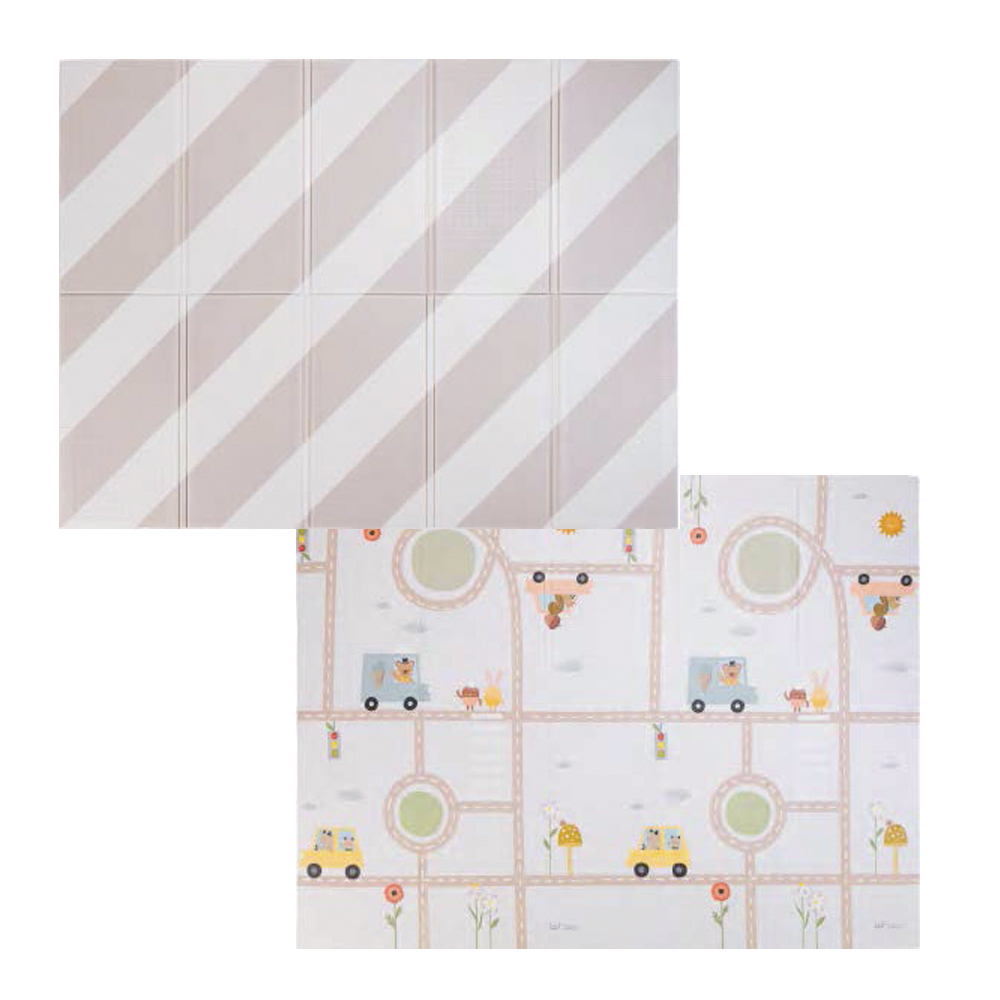 A premium, waterproof, and baby-safe playmat (150x200cm) designed for both comfort and style. One side features a beautifully illustrated fantasy road scene, inviting toddlers to drive toy cars along the winding paths and spark their imagination. The reverse side showcases a clean, modern décor pattern that blends seamlessly into any home environment.This extra-large mat provides a spacious, cushioned area perfect for tummy time, crawling, and active play. It’s reversible, easy to clean, fold, and store, making it ideal for nurseries, playrooms, or on-the-go use.