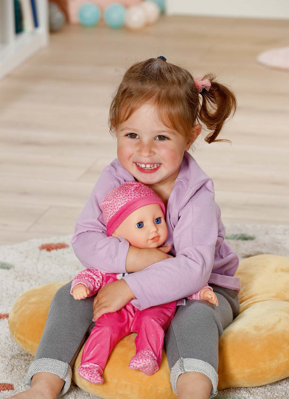 BABY born Anna invites you to cuddle with her soft fabric body and is the ideal first playmate for the little ones with her handy size. It feels particularly cuddly and provides security when playing and sleeping. If you lay her down for an afternoon nap after her bottle, her sleeping eyes close gently as if she were falling asleep peacefully.